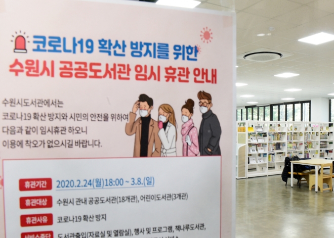 이미지 확대보기경기도 수원시가 코로나바이러스감염증-19 확산을 방지하기 위해 수원시 공공 도서관·박물관·미술관을 3월 8일까지 임시 휴관한다.