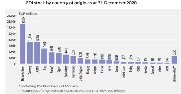주요 투자국을 살펴보면 네덜란드가 총 약 200억 유로로 22%, 독일이 약 110억 유로로 12.2%, 오스트리아가 100억 유로로 12%, 이탈리아가 76억 유로로 8.4%, 프랑스가 56억 유로로 6.2%, 사이프러스가 54억 유로로 6%를 차지했다.