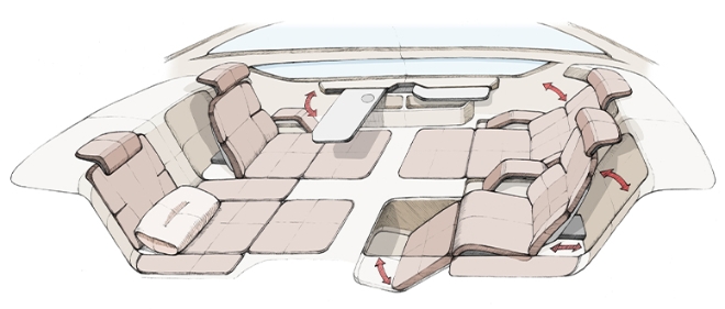운전자가 아닌 탑승자만 있다보니 차체와 실내공간은 기존 차량보다 더 길고 넓다. 당연히 배터리가 탑재된 전기차이며, 시트와 배터리 사이의 공간에 보조배터리나 화물을 넣을 수 있다.