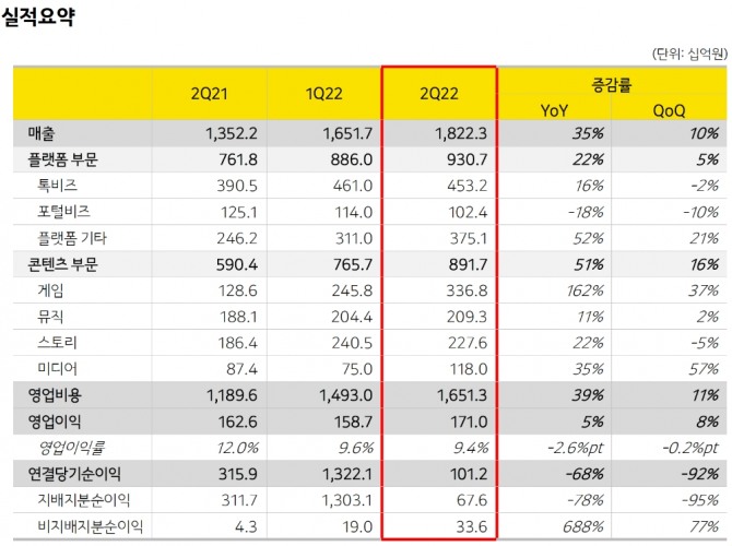 포털비즈 매출은 전 분기 대비 10%, 전년 동기 대비 18% 감소한 1024억 원이다. 플랫폼 기타 부문 매출은 이동 수요 회복 및 카카오페이의 안정적인 수익 확대에 따라 전 분기 대비 21%, 전년 동기 대비 52% 증가한 3751억 원을 기록했다.