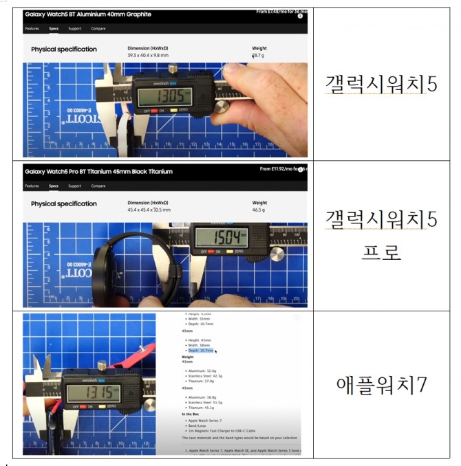 이미지 확대보기16일(현지시간) 해외 언론은 유명유튜버의 갤럭시워치5 리뷰영상을 게재하며 갤럭시워치5의 두께를 실측해 스펙보다 두껍다고 지적했다. 아울러 무게도 시곗줄을 제외한 무게를 기재해 실제 무게보다 가벼운 스펙을 기재한 것으로 드러났다.