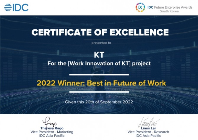 IDC 퓨처엔터프라이즈 어워드 '미래의 업무' 부문 수상 증명서. 사진=KT