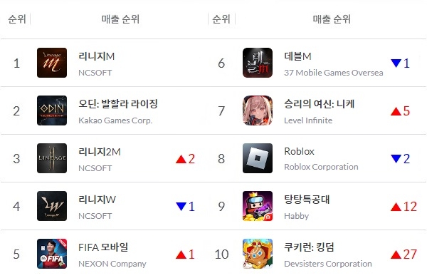 시프트업 '승리의 여신: 니케', 하비 '탕탕특공대' 등이 '쿠키런: 킹덤'과 더불어 새로이 톱10에 올랐다. 지난주 톱10에 들었던 호요버스 '원신', 37게임즈 '히어로즈 테일즈', 넷마블 '블레이드 앤 소울 레볼루션' 등은 각각 19위, 16위, 12위에 자리 잡았다. 매출 11위는 넥슨 '히트2'였다.
