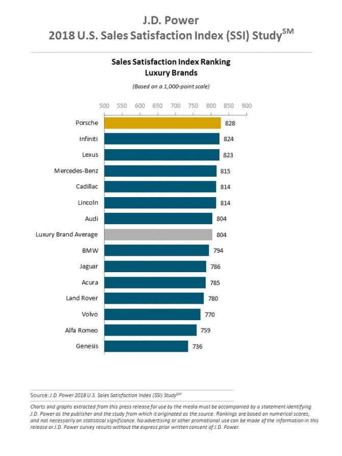 럭셔리 브랜드 중 제네시스는 14위를 랭크되며 900점 만점 중 736점을 얻었다. 포르쉐는 824점을 획득하며 만족도 1위에 올랐으며 렉서스, 메르세데스-벤츠, 캐딜락, 링컨, 아우디가 그 뒤를 따랐다.