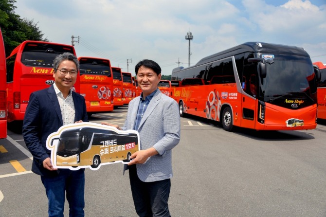 이미지 확대보기기아차는 지난 16일 경기 평택 관광버스 업체 '뉴부자관광' 차고지에서 그랜버드 슈퍼 프리미엄 1호차 전달식을 열었다. 이날 행사에는 윤승규 기아차 B2B사업실장(상무)과 원동호 뉴부자관광 대표를 비롯한 관계자들이 참석했다.
