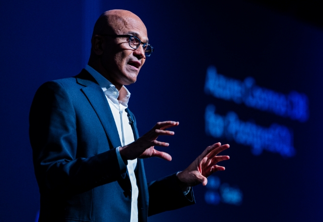 사티아 나델라 마이크로소프트(MS) 최고경영자(CEO)가 지난 15일 오후 서울 강남구 코엑스 인터컨티넨탈호텔에서 열린 MS 개발자 행사인 '마이크로소프트 이그나이트 스포트라이트 온 코리아' 행사에 참석해 기조 연설을 하고 있다. 사진=연합뉴스