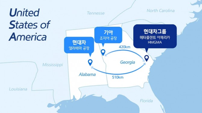 현대차그룹 미국 현지 공장 지도, 조지아주 중심 애틀란타 그래픽=연합이미지 확대보기