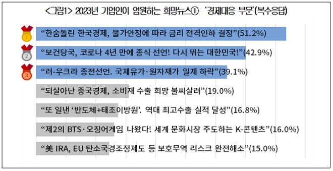 3위는 '국제유가·원자재가 안정(39.1%)'이다. 그 밖에 기업인들이 꼽은 경제대응 부문 희망뉴스로 '중국 등 소비재 수출시장 회복(19.0%)', '반도체 + 태조이방원(태양광·조선·이차전지(배터리)·방산·원자력) 등 주력산업 수출 호조(16.8%)', 'K-콘텐츠 문화산업 수출 확대(16.0%)', '미국 IRA, EU 탄소국경조정제도 등 보호무역 리스크 해소(15.0%)' 등이다.