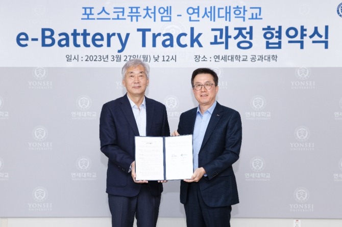 포스코퓨처엠은 연세대와 'e-Battery Track' 협약을 체결했다고 27일 밝혔다. 이 협약에 따라 포스코퓨처엠은 올 하반기부터 연세대에 배터리 소재 석·박사 과정 e-Battery Track을 운영한다.