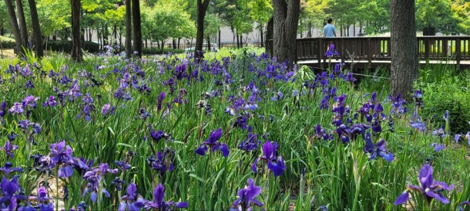 붓꽃정원엔 타래붓꽃이 한창이다. 지난주에 왔을 때만 해도 드물게 눈에 띄던 노랑꽃창포와 보랏빛 창포꽃도 눈에 띈다. 붓꽃은 꽃봉오리가 붓 모양을 닮아 붙여진 이름이지만 영어명인 아이리스(iris)는 그리스 신화 속 무지개 여신이다. 여신 헤라의 예의가 바른 시녀였는데 제우스가 집요하게 사랑을 요구하자 자신의 주인을 배반할 수 없어 무지개로 변하여 헤라에 대한 신의를 지켰다는 전설을 간직하고 있다. 그래서일까. 붓꽃은 이슬비가 내릴 때나, 아침 이슬을 머금고 함초롬히 피어 있을 때 가장 아름답다. 붓꽃의 꽃말은 비 온 뒤에 뜨는 무지개처럼 '기쁜 소식'이다.
