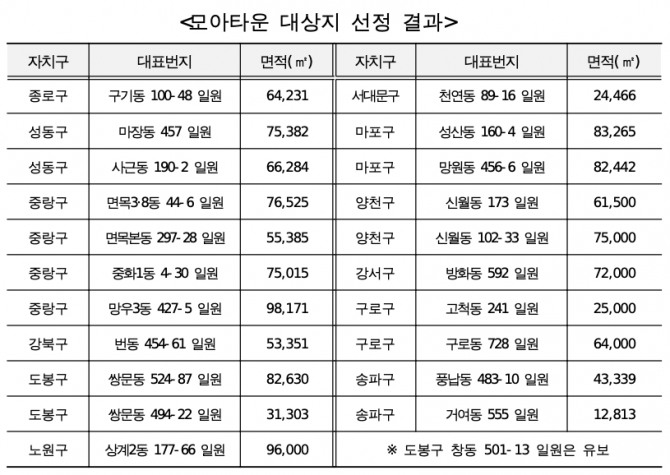 이번 공모에는 14개 자치구 30곳이 참여했다. 시는 지난16일 '모아타운 대상지 선정위원회'를 열고 각 대상지별로 노후도 등 사업의 시급성 등을 종합적으로 검토해 최종 21곳을 대상지로 선정했다.