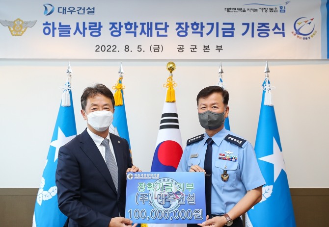 이미지 확대보기이날 기증식에서 백정완 대우건설 사장은 정상화 공군참모총장에게 장학기금 1억원을 전달했다. 기부금은 순직 조종사 유자녀의 학업 지원 장학금으로 사용될 예정이다.