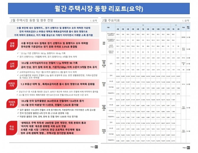 이번에 선보이는 월간 주택시장 동향 리포트는 각종 데이터를 파트별로 구분하고 주택 시장의 주요 지표를 시계열로 분석해(월별, 연도별), 주택 시장의 추이를 한눈에 파악하고 향후 흐름을 전망하는데 용이하다. 가격과 거래, 입주·분양 데이터를 통해 부동산 시장 동향을 빠르게 확인할 수 있고 가계신용과 소비심리 지표 등을 활용해 경제동향도 손쉽게 접근할 수 있다. 지역의 개발 호재, 정부 정책, 타깃 지역 분석 등을 통해 주요 이슈를 진단한다.