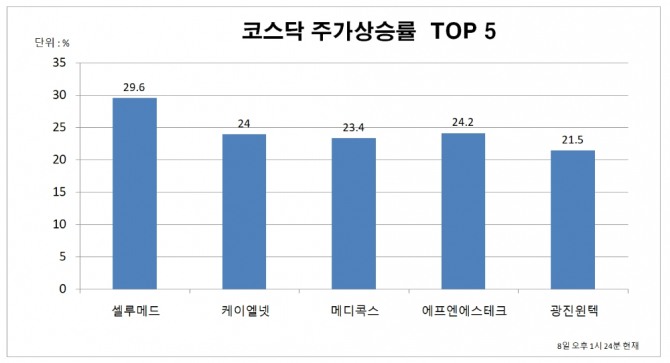 1위 셀루메드 11150원 ( 29.65% ), 2위 케이엘넷 5880원 ( 24.05% ), 3위 메디콕스 1735원 ( 23.49% ), 4위 에프엔에스테크 14600원 ( 24.26% ), 5위 광진윈텍 7060원 ( 21.51% ), 6위 랩지노믹스 31750원 ( 19.59% ), 7위 한국정보통신 11250원 ( 17.55% ), 8위 SK5호스팩 3030원 ( 14.34% ), 9위 씨이랩 70700원 ( 14.96% ), 10위 상상인이안제2호스팩 2675원 ( 13.59% )