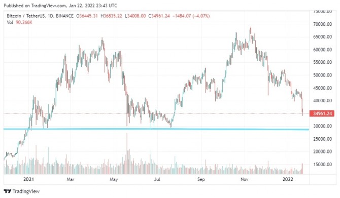 비트코인을 기술적 분석으로 보면 3만5000달러대에서 추가 하락 땐 2만9000달러 후반 가격이 지지선이 될 것으로 보인다.