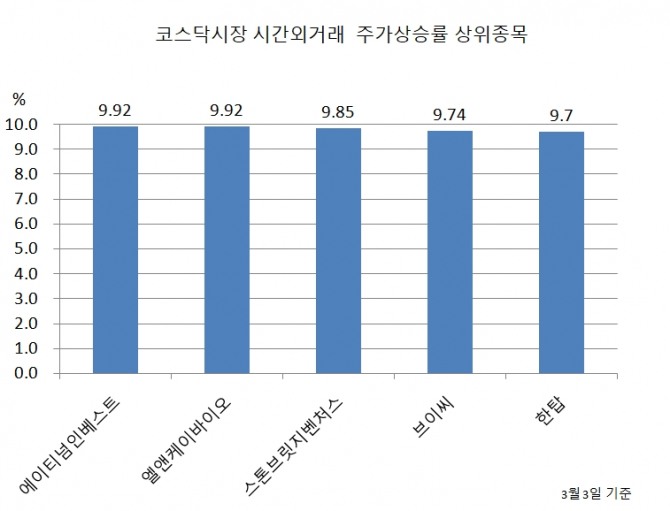 4일 한국거래소에 따르면 에이티넘인베스트는 전날 마감후 이어진 시간외거래에서 9.92% 상승해 시간외거래 상승률 상위권을 차지했다.