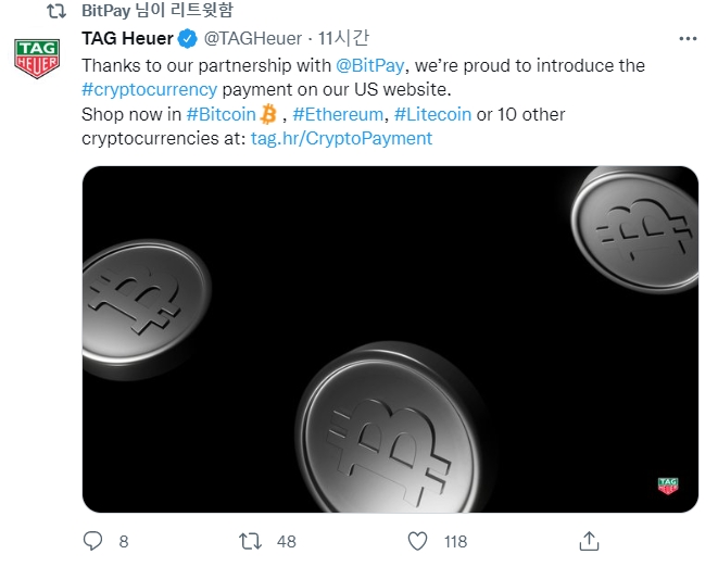 태그호이어는 이날 트위터 계정을 통해 "미국 웹사이트에서 가상화폐 결제를 허용했다"면서 비트코인을 비롯해 이더리움, 라이트코인 등 10개 암호화폐를 수락한다고 밝혔다. 비트페이는 태그호이어의 트윗을 리트윗해 사실을 확인했다.