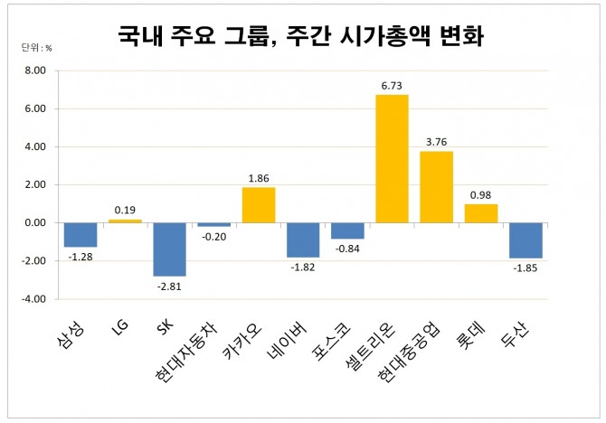 시가총액 1위인 삼성그룹도 한주간 시가총액 7조6432억 줄어들어 590조9361억원을 기록했다.
