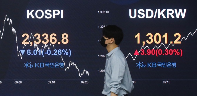 이미지 확대보기23일 한국거래소에 따르면 오후 1시 16분 현재 현재 코스피는 전 거래일 대비 1.32%(30.96포인트) 떨어진 2311.85을 기록하고 있다.