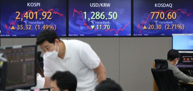 이미지 확대보기27일 한국거래소에 따르면 이날 코스피는 전 거래일 대비 1.49%(35.32포인트) 오른 2401.92에 거래를 마감했다.