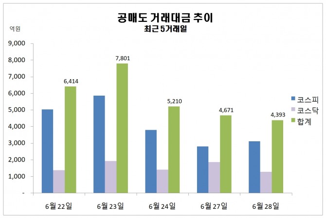 29일 한국거래소에 따르면 지난 28일 주식시장에서 공매도 거래대금 규모는 4393억원을 기록했다.
