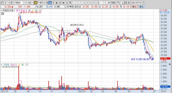 PI첨단소재의 지난달 7일 종가는 5만500원으로 1일 거래되고 있는 3만2500원은 M&A에서 거래된 때의 주가보다 35.64% 하락한 수준입니다.