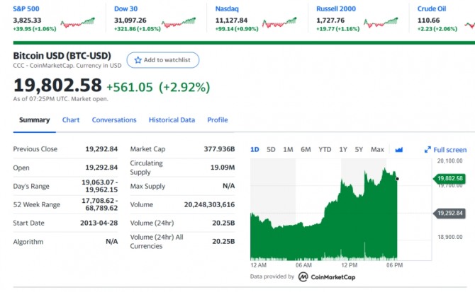 이미지 확대보기5일 뉴욕증시에 따르면 비트코인은 다시 2만달러선에 육박했다.저가 반발매수가 나오면서 암호화폐가 오른것으로 보인다. 유럽 증시는 혼조세로 장을 마쳤다. 프랑스 파리 증시의 CAC40 지수는 0.4% 상승한 5,954.65, 영국 런던 증시의 FTSE 100은 0.9% 오른 7,232.65로 마감했다. 범유럽 지수인 유로 Stoxx50도 0.1% 뛴 3,452.42를 기록했다.