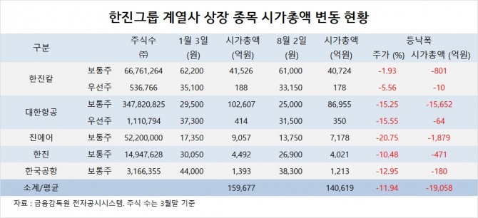 한진그룹의 시총은 연초인 1월 3일 15조9677억원에서 8월 2일 14조619억원으로 11.94%(1조9058억원) 감소했습니다.