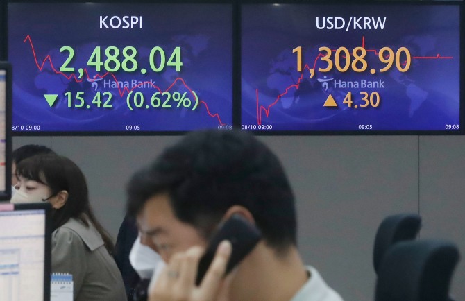 이미지 확대보기10일 한국거래소에 따르면 오전 9시 56분 현재 코스피는 전 거래일 대비 0.82%(20.41포인트) 떨어진 2483.05을 기록하고 있다.