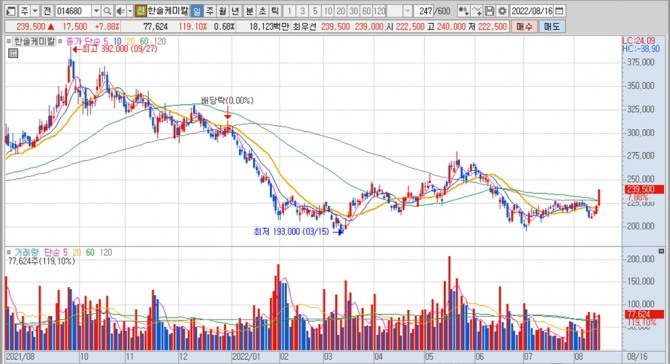 이미지 확대보기한솔케미칼의 주가는 16일 오전 10시 10분 현재 전일보다 1만7500원(7.88%) 오른 23만9500원에 거래되고 있습니다.