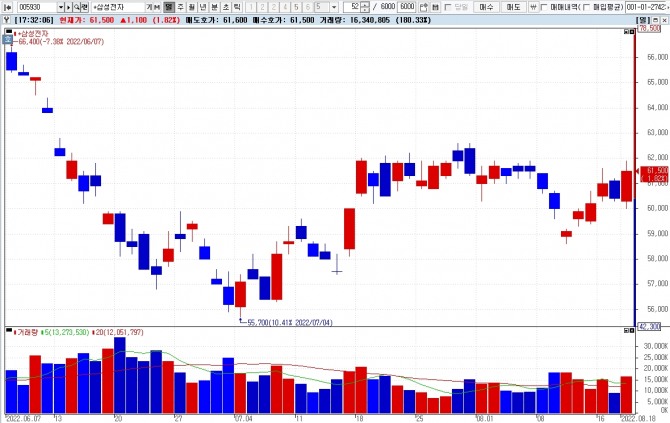 18일 한국거래소에 따르면, 이날 주식시장에서 삼성전자 주가는 전거래일 보다 1.82% 상승한 6만1500원에 거래를 마감했다.