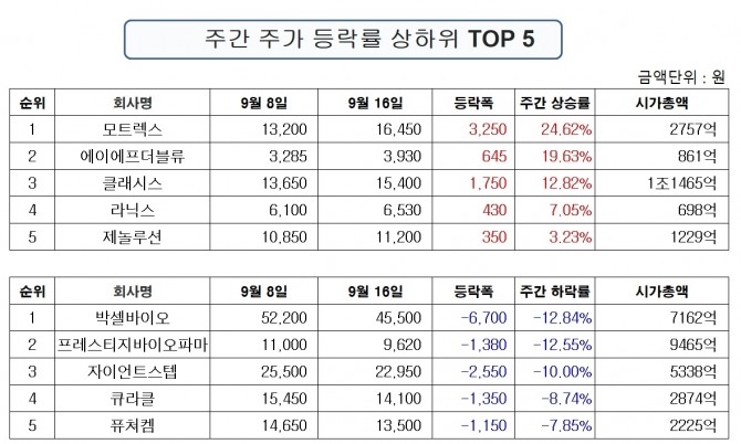 1위 모트렉스 1만6450원 +3250원 (24.62%) ▲2위 에이에프더블류 3930원 +645원 (19.63%) ▲3위 클래시스 1만5400원 +1750원 (12.82%) ▲4위 라닉스 6530원 +430원 (7.05%) ▲5위 제놀루션 1만1200원 +350원 (3.23%)