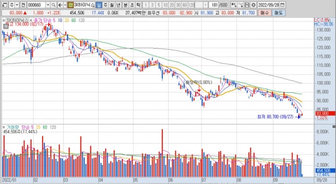 이미지 확대보기SK하이닉스의 주가는 28일 오전 9시 15분 현재 전일보다 1000원(1.22%) 오른 8만3000원에 매매되고 있습니다. SK하이닉스의 주가는 오랜 하락세에서 벗어나 반등을 시도하는 모습입니다.