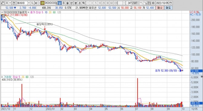 이미지 확대보기SK아이이테크놀로지의 주가는 5일 오전 10시 20분 현재 전일보다 2700원(4.89%) 내린 5만2500원에 거래되고 있습니다.