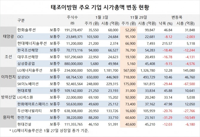 2차전지 업종의 주요 기업의 주가는 업체별로 등락이 엇갈렸습니다. LG에너지솔루션의 11월 29일 주가는 56만7000원으로 연초보다 12.28% 올랐고 삼성SDI가 10.46% 상승했습니다. SK이노베이션은 29.44% 떨어졌습니다.