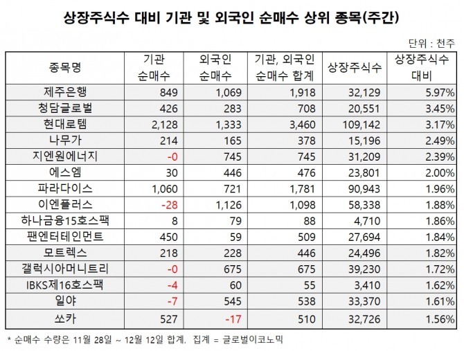 이미지 확대보기4일 글로벌이코노믹이 지난 한주간 기관과 외국인투자자 순매수 종목을 분석한 결과 11월 28일부터 이달 2일까지 기관투자자들은 제주은행 주식을 84만9000주 가량 사들였다.