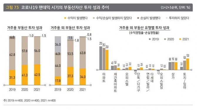 반면 팬데믹 시기에도 '거주용 부동산'과 '거주용 외 부동산'에서는 수익을 낸 것으로 조사됐다. 거주용 부동산에서 '수익이 발생했다'는 비율은 2019년 31.3%에서 2020년 41.3%, 2021년 42.5%로 증가했다.