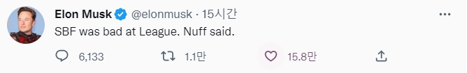 그는 또 "SBF는 리그에서 형편 없었다"라는 글을 트윗해 SBF의 리그 오브 레전드 순위가 낮다고 조롱했다.