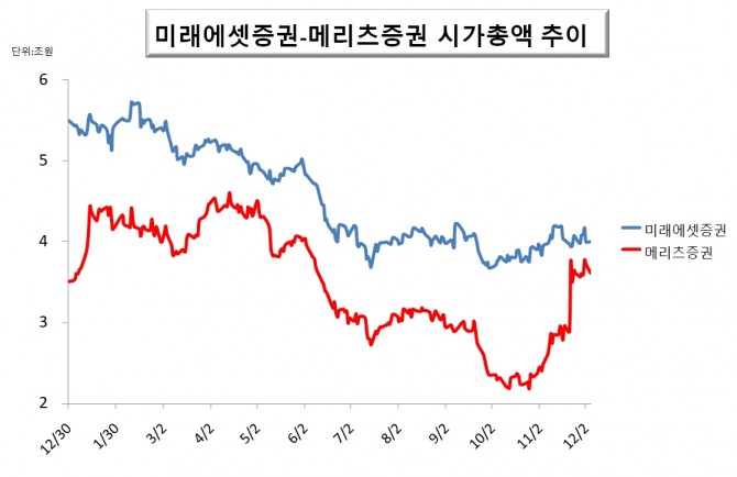 미래에셋증권과 메리츠증권 2022년도 시가총액 추이이미지 확대보기