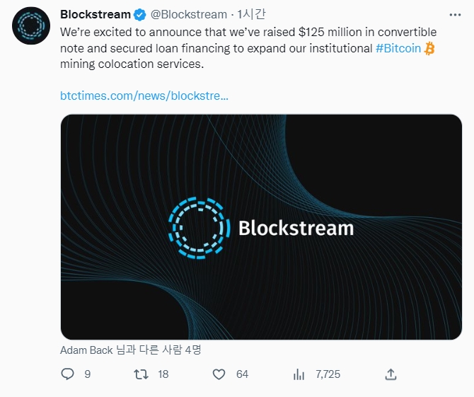 블록스트림은 또 25일 트위터를 통해 "우리는 기관의 #비트코인 채굴 콜로케이션 서비스를 확장하기 위해 전환사채로 1억2500만 달러를 조달하고 대출 자금을 확보했다고 발표하게 되어 기쁘다"고 게재했다.