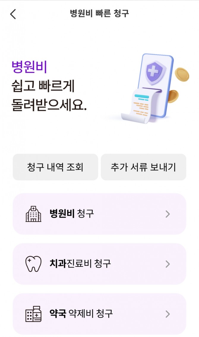 병원비,치과 진료비 및 약국 약제비까지 청구할 수 있으며, 특히 전국 약 3,000개 이상의 제휴 병원의 경우에는 별도 서류 없이 진료 내역 조회만으로도 청구 가능하다. 그 외 병원의 경우는 진료 내역 사진 촬영만 하면 청구할 수 있다.