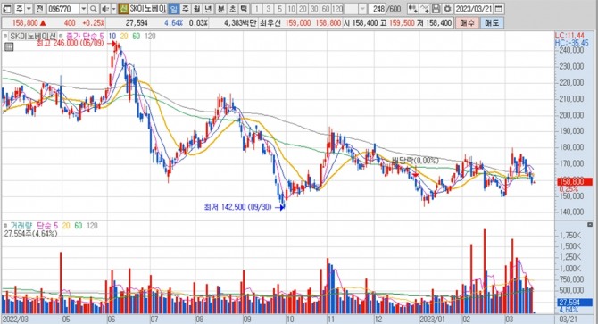 SK이노베이션의 지난 1년여간 주가 변동 추이. 키움증권 HTS 캡처