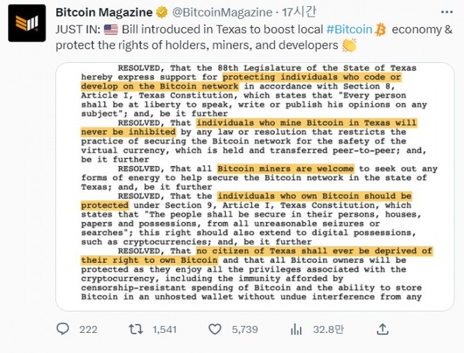 따라서 이 법안은 "텍사스 헌법에 포함된 가치 있는 항목에 관한 특정 원칙을 가지고 있으며, 이러한 원칙은 비트코인 사용 및 보관과 관련해 모든 시민에게 적용되어야 한다"고 설명하고 있다.