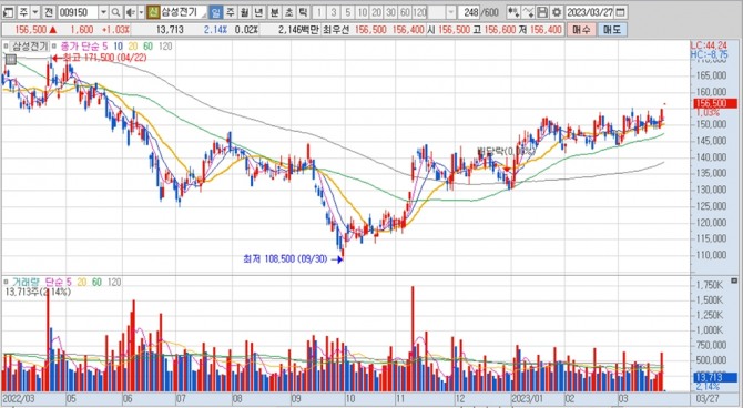 이미지 확대보기삼성전기의 주가는 27일 오전 9시 1분 현재 전일보다 1600원(1.03%) 오른 15만6500원에 거래되고 있습니다.