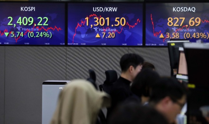 27일 한국거래소에 따르면 이날 코스피는 전거래일 대비 0.24%(5.74포인트) 떨어진 2409.22에 거래를 마감했다.
