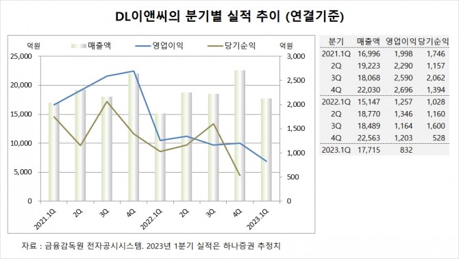 한국투자증권은 DL이앤씨의 올해 1분기 연결기준 매출액이 1조7715억원, 영업이익이 832억원에 이를 것으로 전망하고 있습니다.