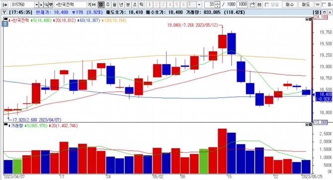 25일 한국거래소에 따르면 한국전력 주가는 이날 1만8400원에 마감하면서 지난 24일 종가 1만8570원과 비교해 0.92%(170원) 하락한 것으로 나타났다.