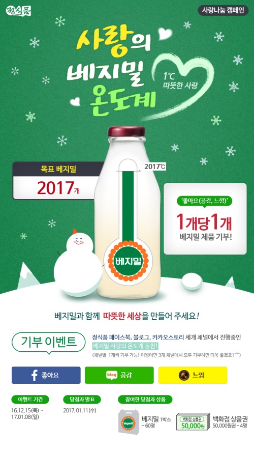 캠페인은 정식품 공식 SNS을 클릭하면 참여가 완료된다. 게시물 클릭 시 마다 사랑의 베지밀 온도계가 1℃ 상승하고, 상승한 온도만큼 베지밀 두유가 기부되는 방식으로 캠페인은 내달 8일까지 진행된다.