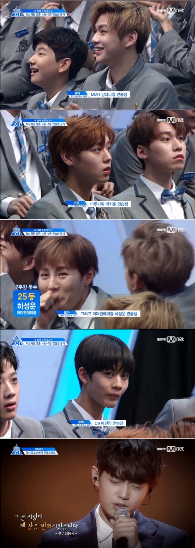 강동호는 생방송 무대에서 최대한 좋은 모습 보여드리겠다고 인사했다. 개인연습생 김재환은 보아에게 메인 보컬로 입지를 다졌다는 칭찬을 들었다. 5등에서 출발해 20등에서 14등으로 상승한 안형섭은 "생방송까지 가게 돼서 감사드린다"고 말했다. 7차 평가에서 20등에서 5단계 상승한 최민기는 "투표해주시고 응원해주셔서 감사드린다"고 밝혔다.