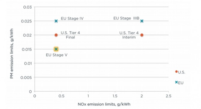 이미지 확대보기유럽은 디젤 엔진의 미세물질(PM) 배출을 제한하기 위해 스테이지 5(Stage V) 규제를 지난해부터 시행해왔다. 2018년까지 적용됐던 스테이지 4는 PM 0.025g/kWh(1000W의 파워 엔진을 1시간동안 작동) 를 준수해야 했으나 2019년부터 시행된 스테이지 5는 이에 대한 규제를 강화해 PM 0.015g/kWh를 지켜야 한다.